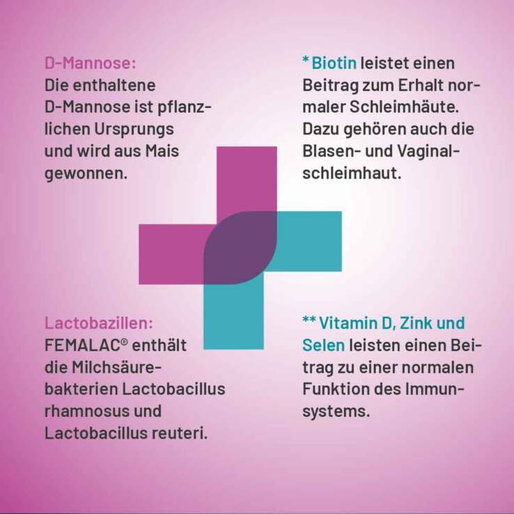 FEMALAC D-Mannose + Lactobazillen ist ein Nahrungsergänzungsmittel. Die enthaltene D-Mannose ist eine Zuckerart, die in der Natur vorkommt und mit Glucose verwandt ist. Sie ist pflanzlichen Ursprungs und wird aus Mais gewonnen. Zudem kombiniert FEMALAC® zwei ausgewählte Stämme der Milchsäurebakterien Lactobacillus rhamnosus und Lactobacillus reuterii.