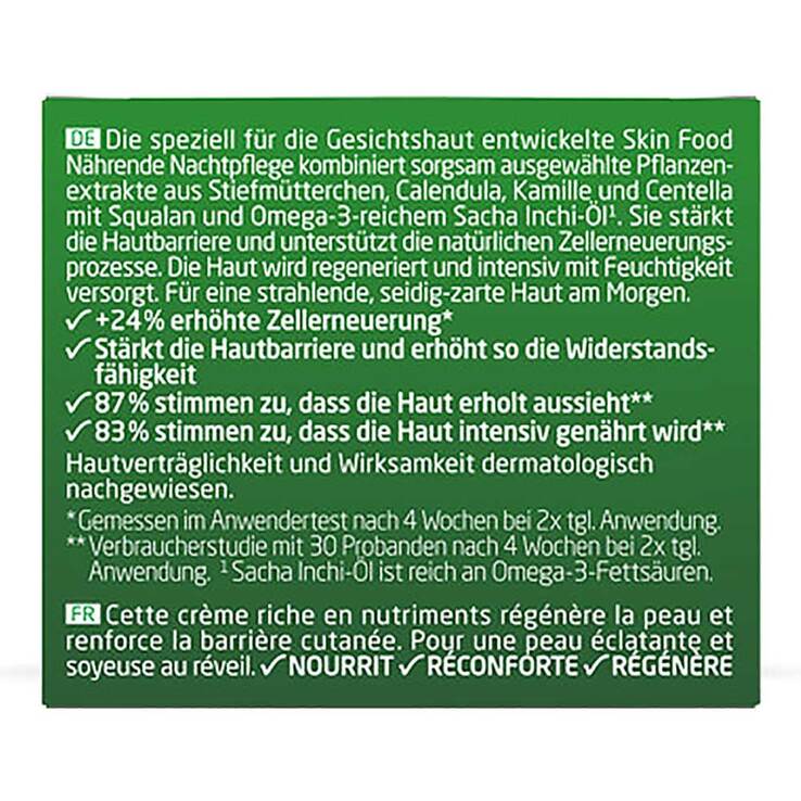 Die speziell für die Gesichtshaut entwickelte Skin Food Nährende Nachtpflege kombiniert sorgsam ausgewählte Pflanzenextrakte aus Stiefmütterchen, Calendula, Kamille und Centella mit Squalan und omega-3-reichem Sacha-Inchiöl. Sie stärkt die Hautbarriere und unterstützt die natürlichen Zellerneuerungsprozesse. Die Haut wird regeneriert und intensiv mit Feuchtigkeit versorgt. Für eine strahlende, seidig-zarte Haut am Morgen.