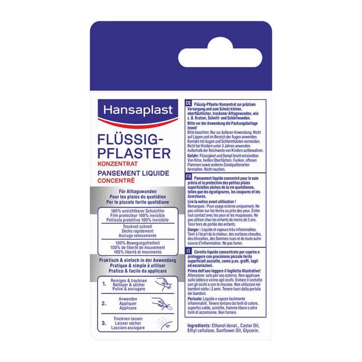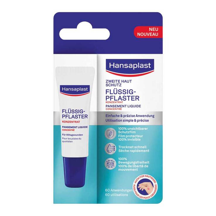 Das Hansaplast Flüssigpflaster-Konzentrat wurde für die gezielte Versorgung kleiner, oberflächlicher und trockener Wunden wie Kratzern, Schnitten oder Schürfwunden entwickelt. Es eignet sich zudem zur Behandlung von rissiger Haut und kann bei Kindern ab 3 Jahren angewendet werden. Nach dem Auftragen trocknet der ultradünne, unsichtbare Film schnell und schützt die Wunde zuverlässig vor Wasser und Schmutz. Er passt sich flexibel an und bietet volle Bewegungsfreiheit.