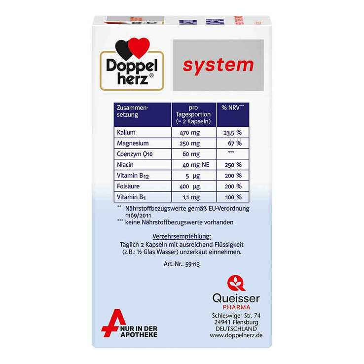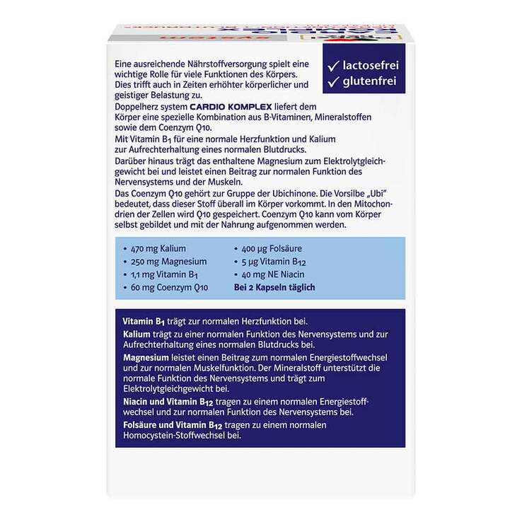 Eine ausreichende Nährstoffversorgung spielt eine wichtige Rolle für viele Funktionen des Körpers. Doppelherz system Cardio Komplex liefert dem Körper eine spezielle Kombination aus B-Vitaminen, Mineralstoffen sowie dem Coenzym Q10. Mit Vitamin B1 für eine normale Herzfunktion und Kalium zur Aufrechterhaltung eines normalen Blutdrucks.