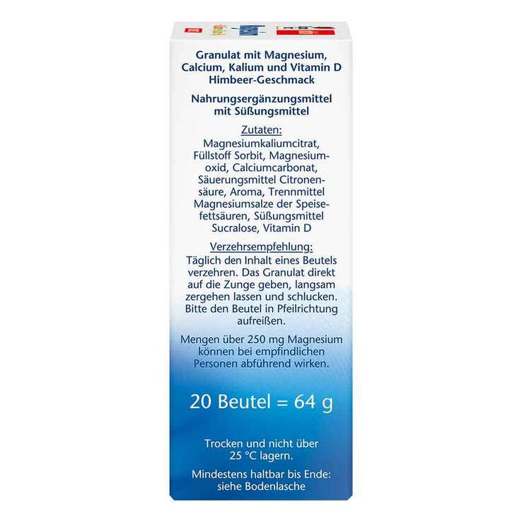 *Calcium wird für die Erhaltung normaler Knochen und normaler Zähne benötigt. Kalium trägt zur Aufrechterhaltung eines normalen Blutdrucks, einer normalen Muskelfunktion und einer normalen Funktion des Nervensystems bei. Magnesium trägt zu einem normalen Energiestoffwechsel, einer normalen Muskelfunktion und zu einer normalen Funktion des Nervensystems bei. Vitamin D trägt zu einem normalen Calciumspiegel im Blut bei, zu einer normalen Funktion des Immunsystems, zur Erhaltung normaler Knochen sowie zur Erhaltung einer normalen Muskelfunktion bei.
