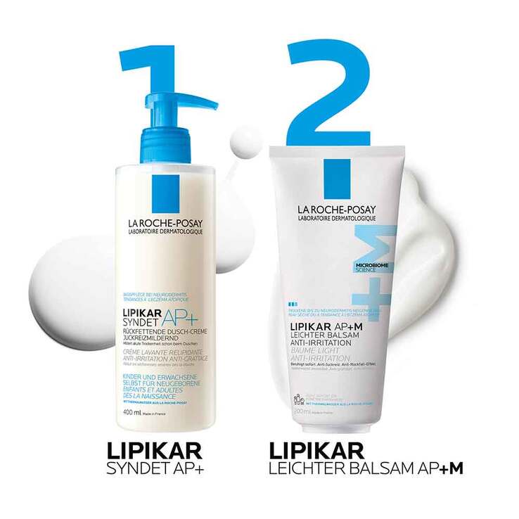 Eine zusätzliche Pflege für trockene, zu Neurodermitis oder Allergien neigende Haut sind die rückfettende Lipikar Syndet AP+ Duschcreme, das Lipikar Dusch- und Badeöl AP+ und die Lipikar Eczema Med Akutpflege.