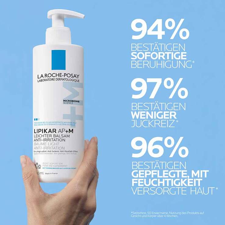 Lipikar leichter Balsam AP+M zieht unter 1 Minute ein und hinterlässt ein angenehmes Hautgefühl.