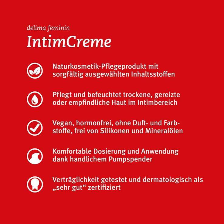 Delima feminin Intim Creme spendet Feuchtigkeit bei Intimtrockenheit und pflegt und schützt die sensible Intimhaut. Die Creme hinterlässt ein langanhaltend gutes Gefühl auf der Haut im Intimbereich. Sie enthält Granatapfelkernextrakt, Hyaluronsäure, Aloe Vera Saft, Traubenkernöl und weitere wertvolle Inhaltsstoffe.