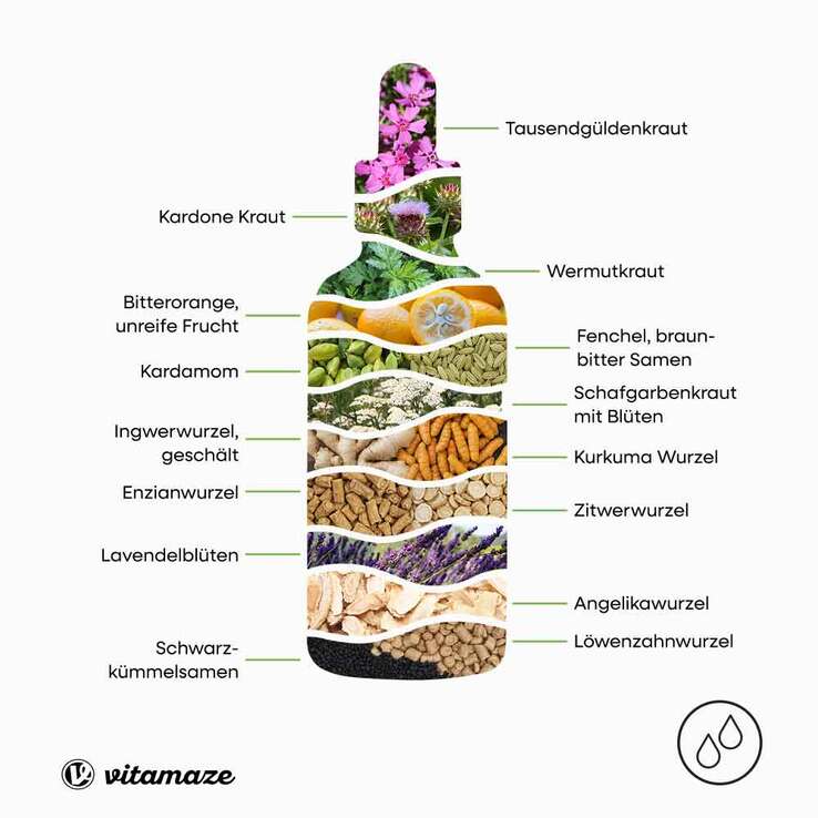 Wasser; Cholinbitartrat; wässrige Pflanzenextrakte* [Tausendgüldenkraut (Centaurium erythraea Rafn) zweiblütige Spitzen 1,37%, Wermutkraut (Artemisia absinthium L.) 1,37%, Kardone (Cynara cardunculus L.) Kraut 1,37%, Enzianwurzel (Gentiana lutea L.) 1,23%, Bitterorange (Citrus aurantium L.) unreife Frucht 0,82%, Ingwerwurzel (Zingiber officinale Roscoe) geschält 0,82%, Kardamom (Elettaria cardamomum (L.) Maton) ganze Frucht 0,82%, Kurkuma (Curcuma longa L.) Wurzel 0,82%, Löwenzahnwurzel (Taraxacum officinale F.H. Wigg.) 0,82%, Schafgarbenkraut (Achillea millefolium L.) mit Blüten 0,82%, Angelikawurzel (Angelicaarchangelica L.) 0,82%, Zitwerwurzel (Curcuma zedoaria (Christm.) Roscoe) 0,82%, Fenchel (Foeniculum vulgare Mill.) Samen 0,55%, Schwarzkümmelsamen (Nigella sativa L.) 0,27%, Lavendelblüten (Lavandula hybrida Reverchon ex. Briq.) 0,27%]; Konservierungsstoffe: Kaliumsorbat und Natriumbenzoat.