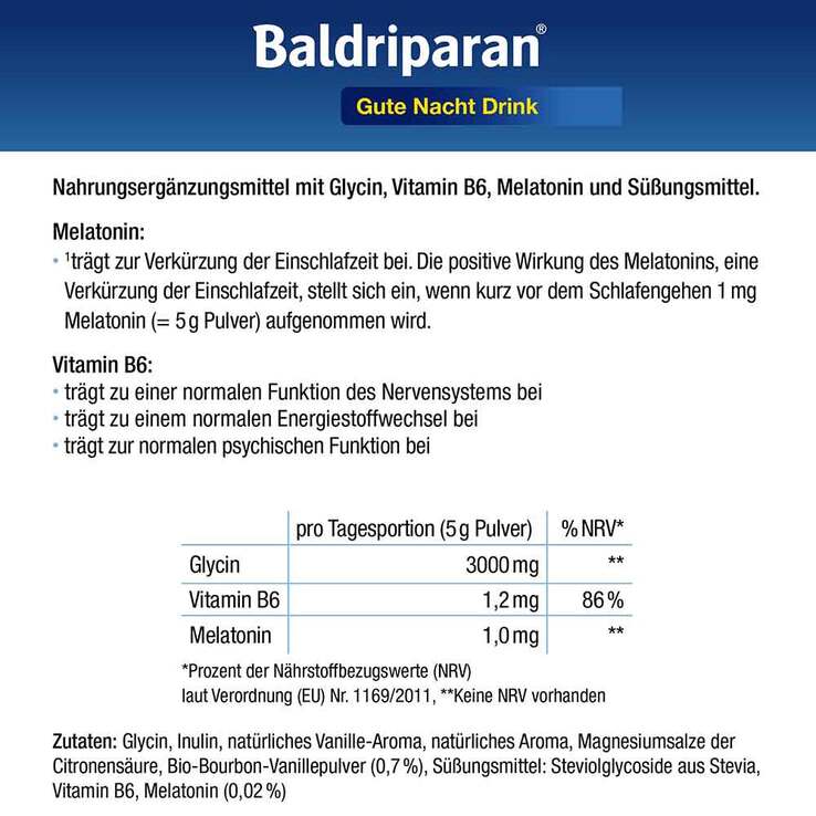 Glycin, Inulin, natürliches Vanille-Aroma, natürliches Aroma, Magnesiumsalze der Citronensäure, BioBourbon-Vanillepulver (0,7%), Süßungsmittel: Steviolglycoside aus Stevia, Vitamin B6, Melatonin (0,02%).