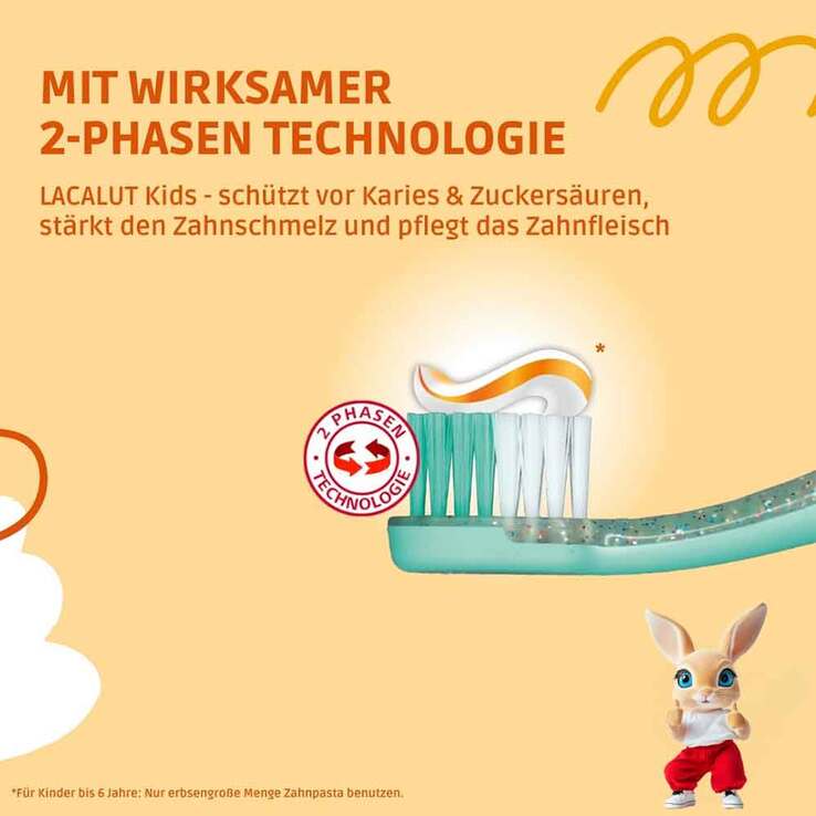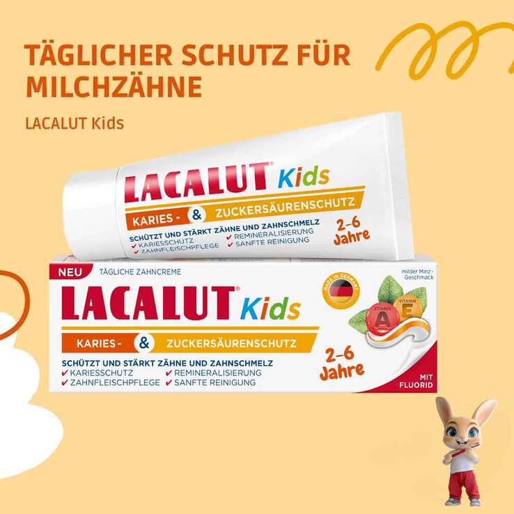 Lacalut Kids Karies- & Zuckersäurenschutz Zahncreme schützt Milchzähne und empfindliche Kinderzähne vor Karies und zahnschädigenden Zuckersäuren durch Fluorid.