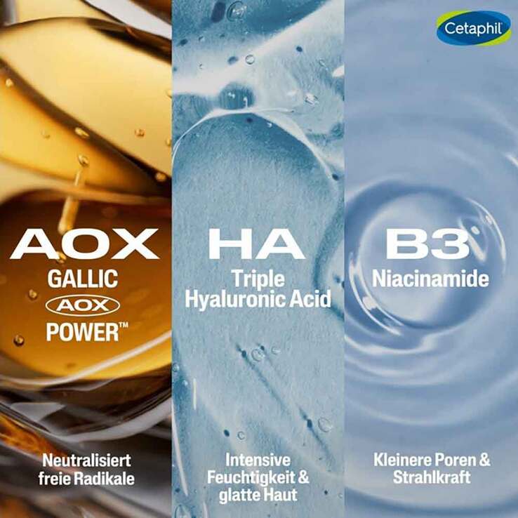 3-fach Hyaluron-Komplex: Hyaluronsäure in drei Molekulargrößen für eine Tiefenwirkung – sorgt für intensive Feuchtigkeit und sichtbar glattere Haut.