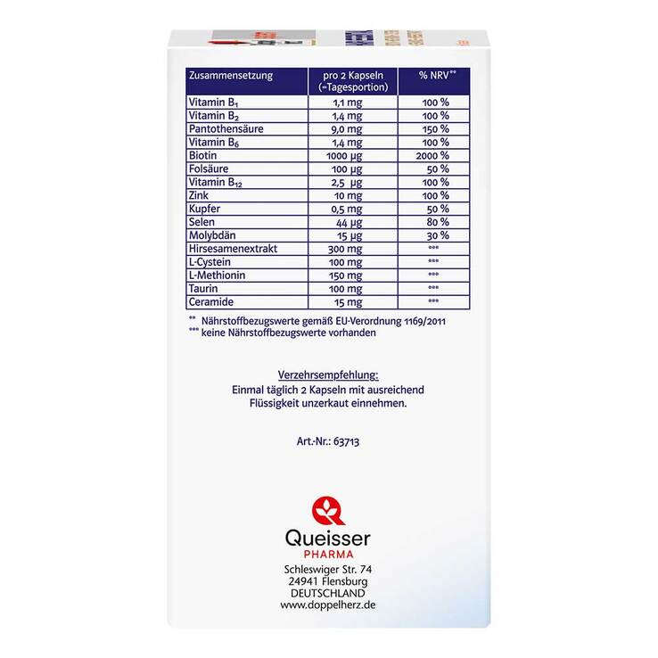 *Biotin, Selen und Zink tragen zur Erhaltung normaler Haare bei. Kupfer trägt zu einer normalen Haarpigmentierung bei. Biotin, Vitamin B2/Riboflavin und Zink tragen zur Erhaltung normaler Haut bei. Folat/Folsäure und Vitamin B12 tragen zur Verringerung von Müdigkeit und Ermüdung bei. Pantothensäure, Vitamin B1/Thiamin und Vitamin B6 tragen zu einem normalen Energiestoffwechsel bei.