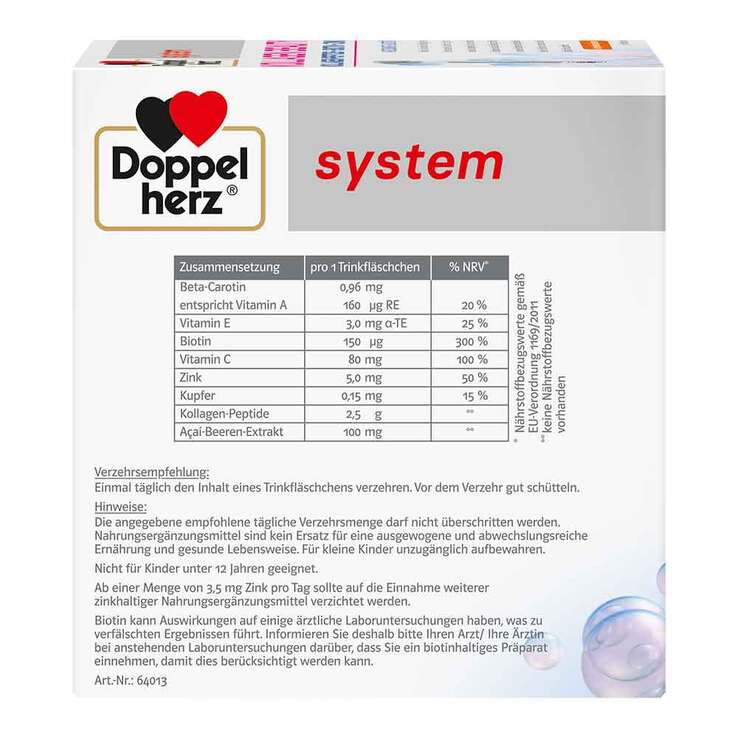 *Biotin, Zink und Vitamin A tragen zur Erhaltung normaler Haare bei. Biotin und Zink tragen zur Erhaltung normaler Haut bei. Kupfer trägt zur Erhaltung von normalem Bindegewebe bei. Kupfer trägt zu einer normalen Haut- und Haarpigmentierung bei. Vitamin C trägt zu einer normalen Kollagenbildung für eine normale Funktion der Haut bei. Vitamin C und Vitamin E tragen dazu bei, die Zellen vor oxidativem Stress zu schützen.