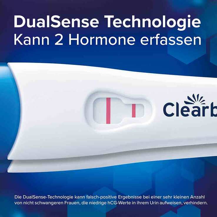 Bei diesem Schwangerschaftest von Clearblue handelt es sich um einen Ultra Frühtest, das die Ergebnisse schon 6 Tage vor dem Ausbleiben der Periode anzeigt. Ausgestattet ist dieser Test mit der Dualsense-Technologie. Dadurch ist dieser Test in der Lage 2 Hormone, nämlic hCG und FSH, zu erfassen. So können falsch-positive Ergebnisse bei einer sehr kleinen Anzahl von nicht schwangeren Frauen, die niedrige hCG-Werte in ihrem Urin aufweisen, verhindert werden.
