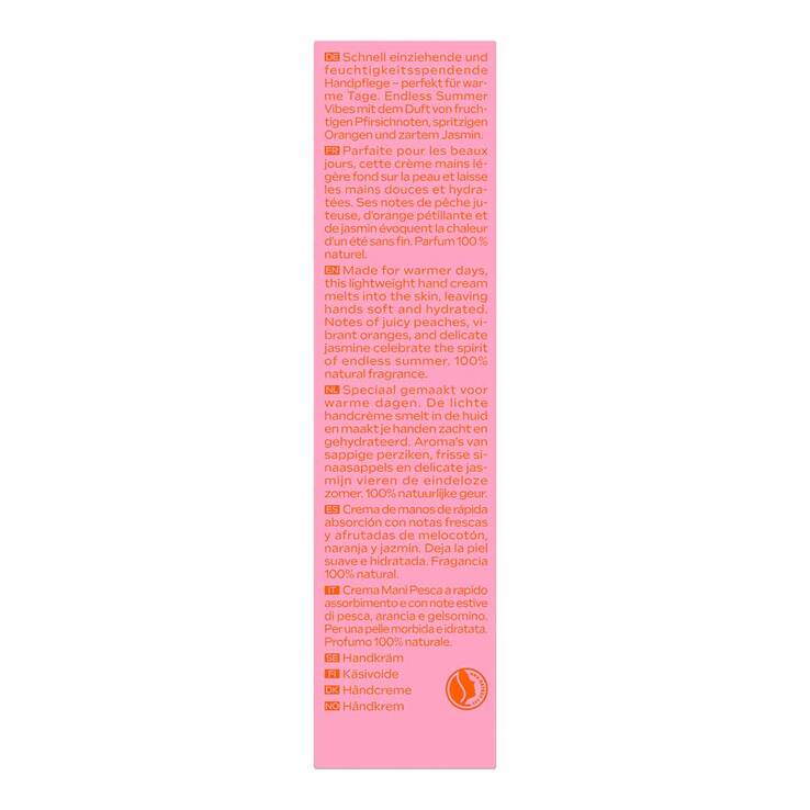 Für die warmen Tage des Jahres kreiert, verwöhnt diese leichte, schnell einziehende Handcreme die Haut. Das Ergebnis: weiche, hydratisierte Hände - bereit für den Sommer. Mit Noten von saftigem Pfirsich, lebhafter Orange und einem Hauch von zarter Jasmin erfüllt ihr 100% natürlicher Duft die Luft mit dem unbeschwerten Spirit eines endlosen Sommers.