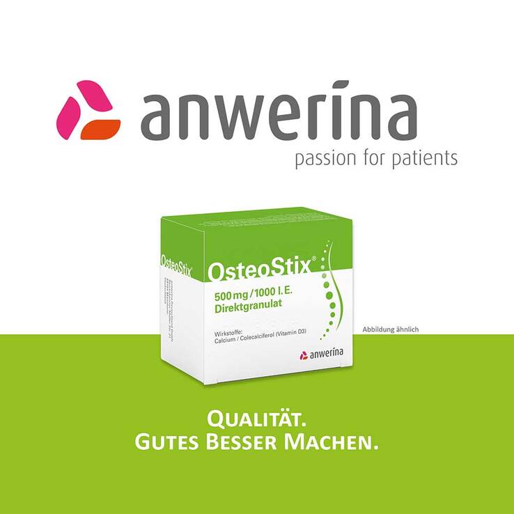 OsteoStix® 500 mg/1000 I.E. Direktgranulat. Wirkstoffe: Calciumcarbonat (entspr. 500 mg Calcium), Colecalciferol-Trockenkonzentrat (entspr. 25 Mikrogramm Colecalciferol = 1000 I.E. Vitamin D3). Anwendungsgebiete: Zur Prophylaxe u. Behandl. von kombinierten Calcium- u. Vitamin D-Mangelzuständen b. älteren Menschen; als Calcium- u. Vitamin D-Ergänzung zusätz. zu einer spezifischen Behandl. der Osteoporose (Knochenschwund) von Patienten mit einem Risiko für einen kombinierten Vitamin D- u. Calcium-Mangel. Warnhinweis: Enthält Aspartam, Sorbitol, Isomalt, Benzylalkohol u. Sucrose. Verkaufsabgrenzung: Apothekenpflichtig. Stand: August 2024. Zulassungsinhaber: anwerina Deutschland GmbH, Reichskanzler-Müller-Str. 21, 68165 Mannheim. Zu Risiken und Nebenwirkungen lesen Sie die Packungsbeilage und fragen Sie Ihre Ärztin, Ihren Arzt oder in Ihrer Apotheke.