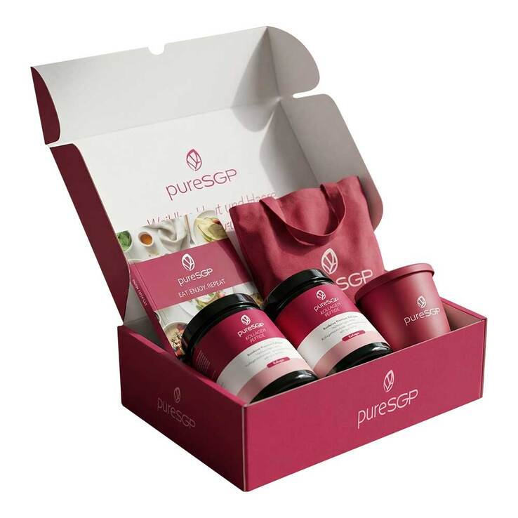 Das pureSGP® Kollagen Starter Set enthält zwei Dosen pureSGP® Kollagen Peptide (je 300 g) sowie Gratisgeschenke in Form eines Kochbuchs, eines To-Go-Bechers und eines Jutebeutels (Die Farbe des To-Go-Bechers und des Jutebeutels kann vaiieren und obliegt der Verfügbarkeit. Die Artikel werden dem Starter Set entweder in Weiß oder in Pink beigelegt.).