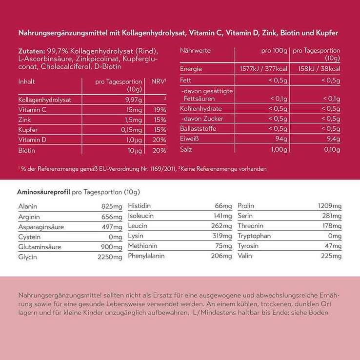 99,7% Kollagenhydrolysat (Rind), L-Ascorbinsäure, Zinkpicolinat, Kupfergluconat, Cholecalciferol, D-Biotin.